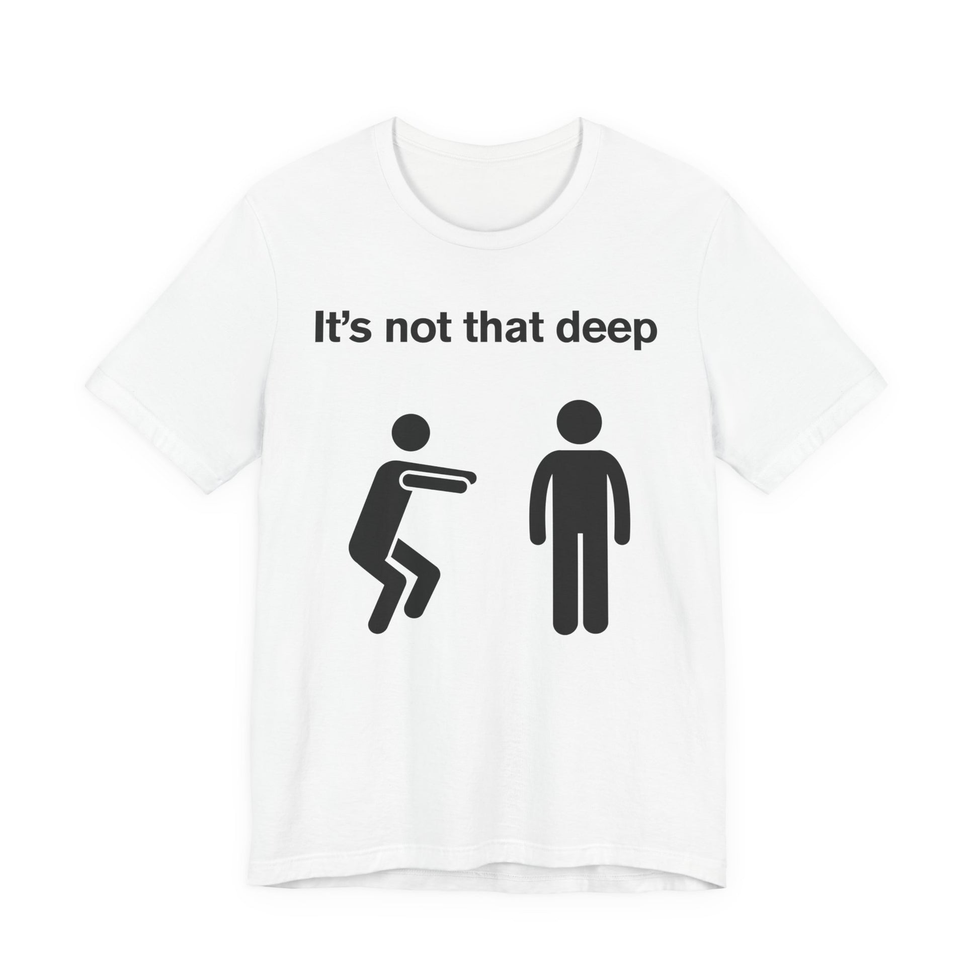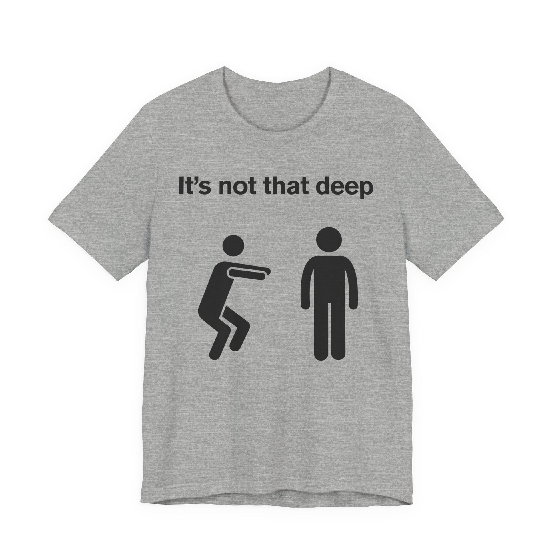 Dress it up for the gym ;) or keep it low-key for a weekend vibe, this tee fits seamlessly into anyone's wardrobe. Ideal for those who love humor and a laid-back lifestyle, it’s also the perfect gift for friends and family on occasions like birthdays, holidays, or just to brighten someone’s day. Bring a smile to everyone with a tee that says it's not that deep, celebrating your love for exercise, fun, humor, simplicity and joy in everyday life!