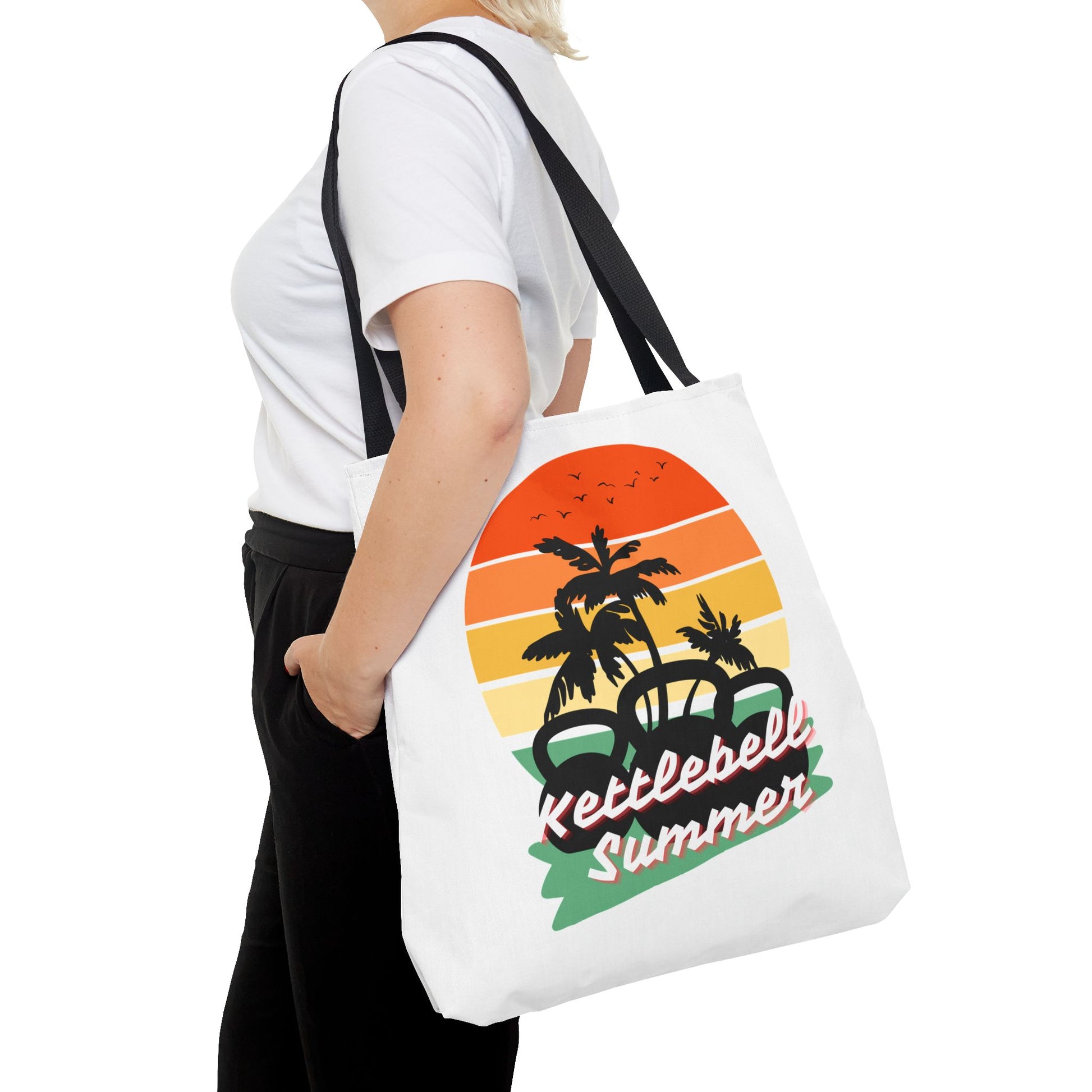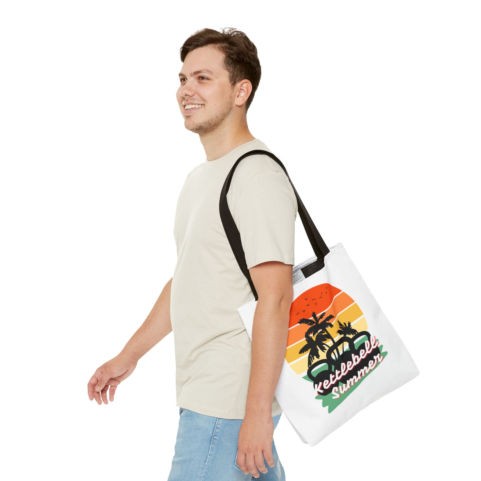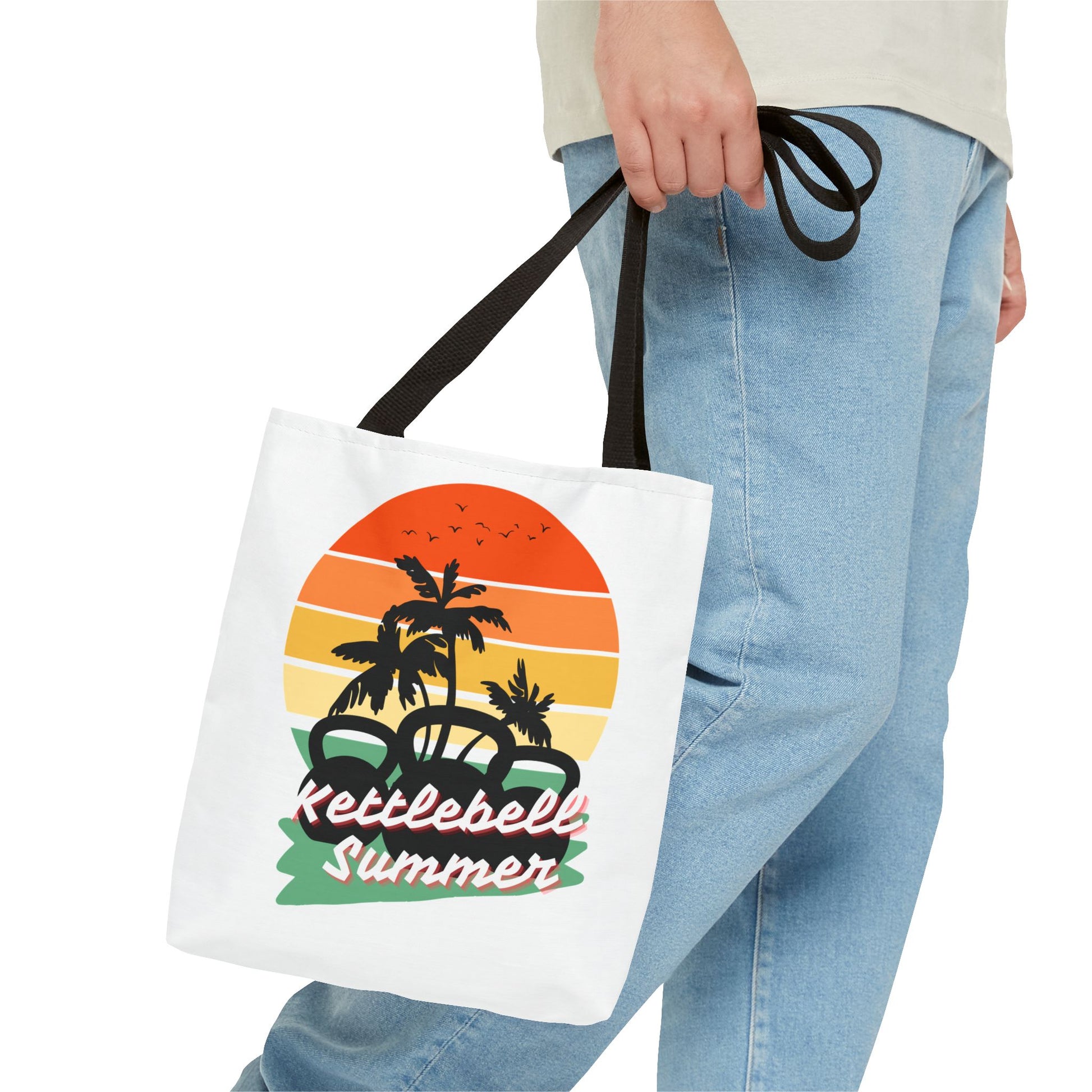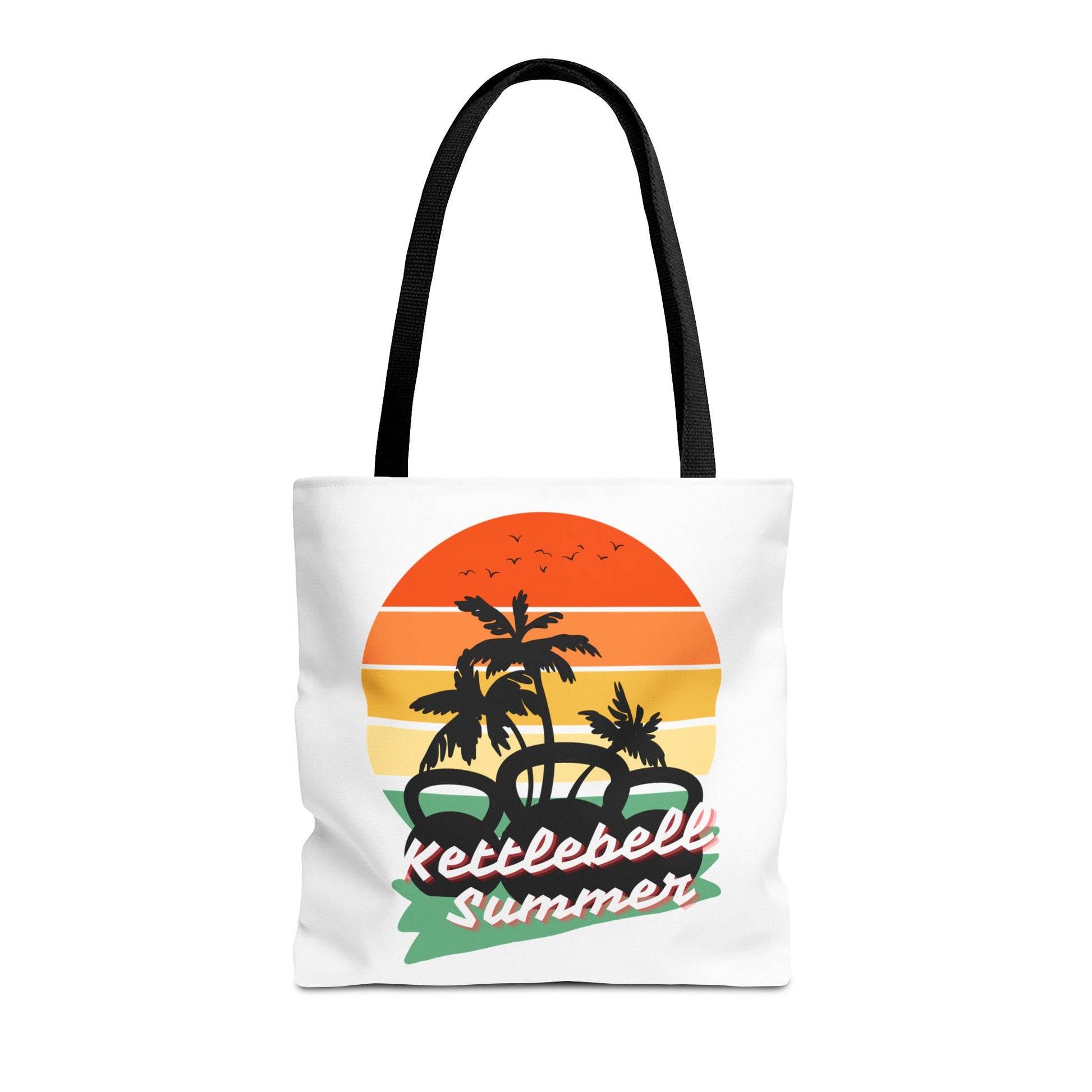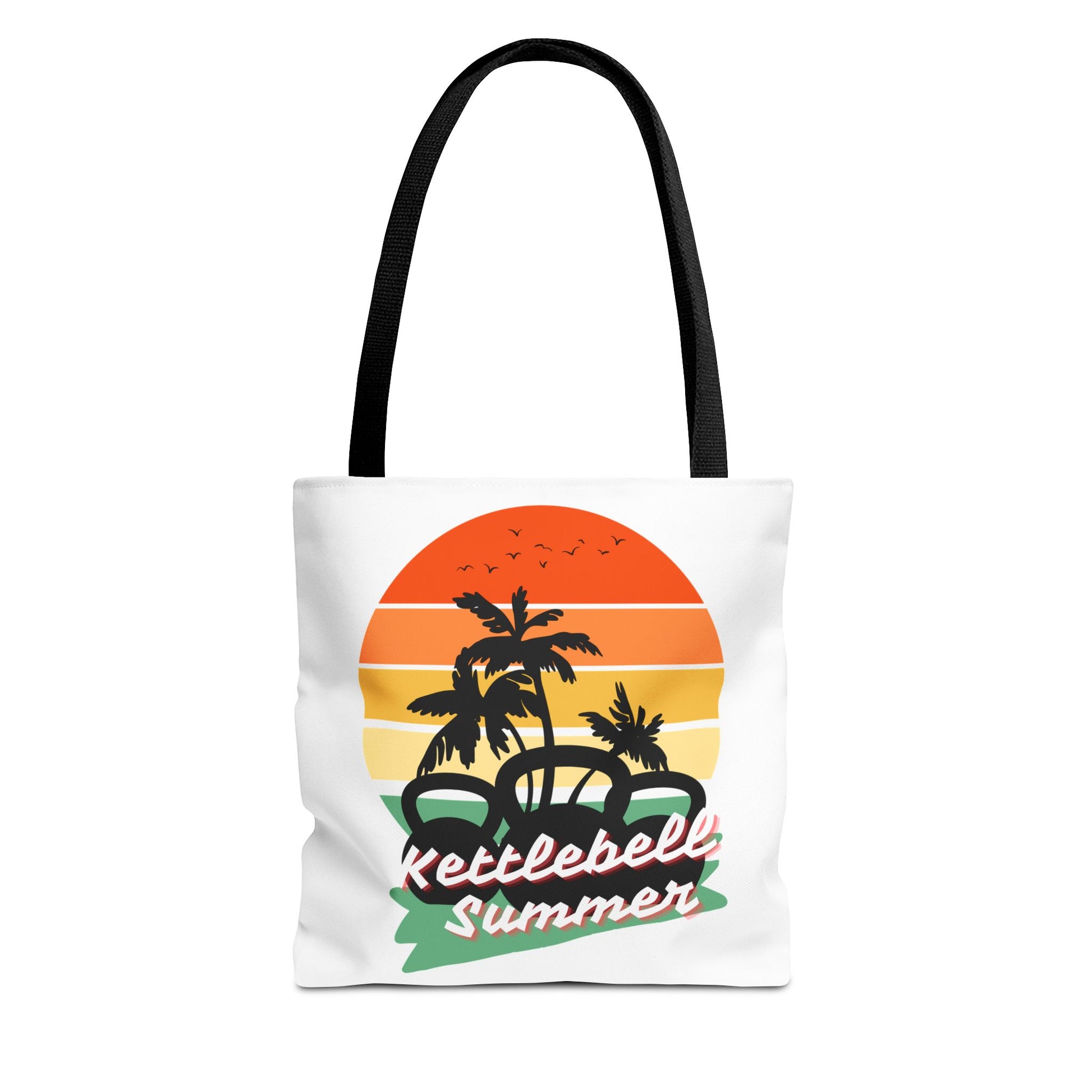 Function and style! These custom-printed Kettlebell Summer tote bags come with black handles, double-stitched seams, and nonwoven laminate lining for high-end durability. Use it as a gym bag, book bag, everything-going-on bag! For yourself, fitness lovers, gym buddies and friends :)